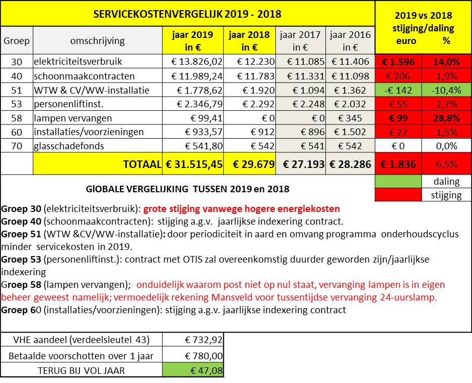 Onderstaand vindt u een kostenvergelijking, inclusief toelichting, tussen de servicekosten over de afgelopen twee jaar vergeleken met het voorafgaande jaar. Een overzicht, zowel in tabelvorm als in een grafiek, van de ontwikkeling van de servicekosten sinds 2012 (het eerste volle jaar waarover servicekosten zijn betaald) is helemaal onderaan gevoegd.